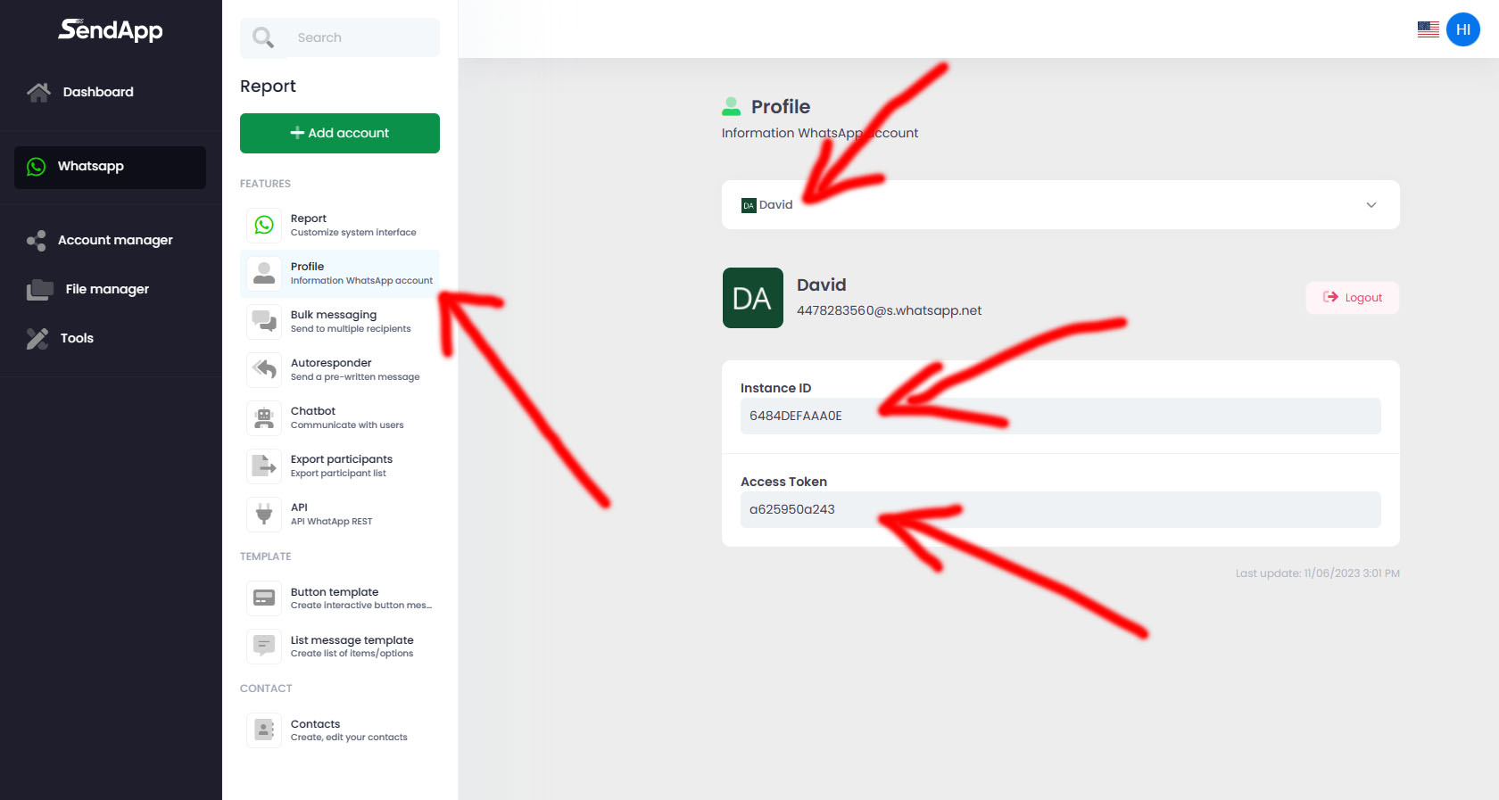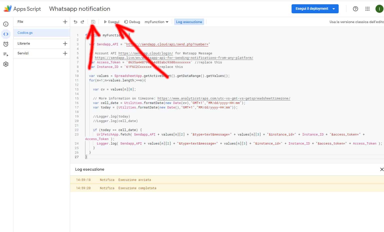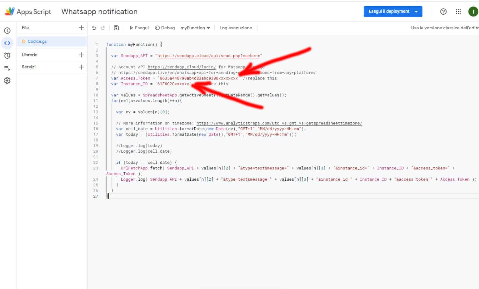 • Edit the script by pasting your Access_Token and Instance_ID from Whatsap APIs Sendapp.cloud