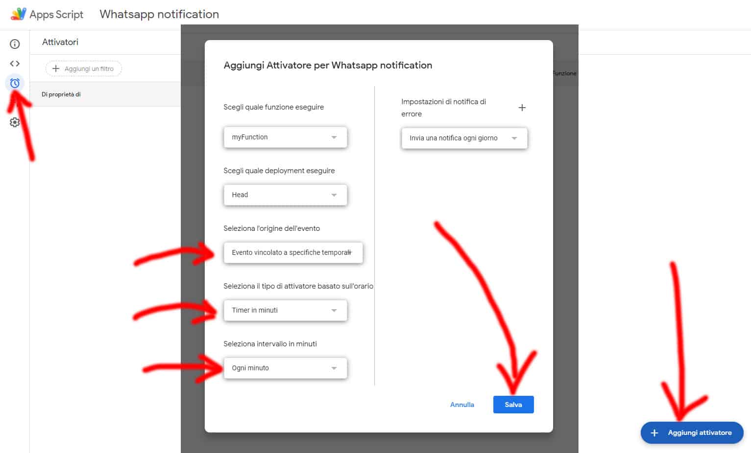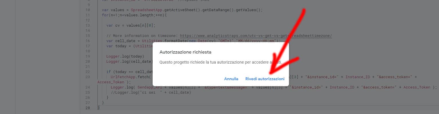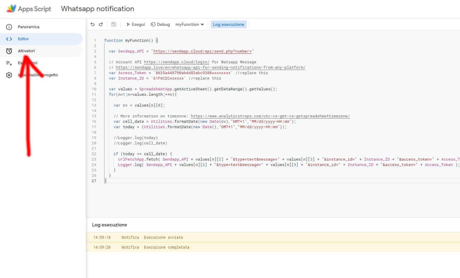 function myFunction() { var Sendapp_API = "https://app.sendapp.cloud/api/send?number=" // Account API https://sendapp.cloud/login/ for Watsapp Message // https://sendapp.live/en/whatsapp-api-for-sending-notifications-from-any-platform/ var Access_Token = '863a83xxxxxx' //replace this var Instance_ID = '61F2C8xxxxx' //replace this var values = SpreadsheetApp.getActiveSheet().getDataRange().getValues(); for(n=1;n